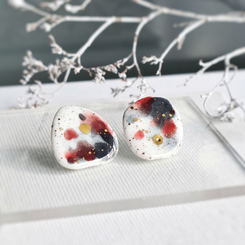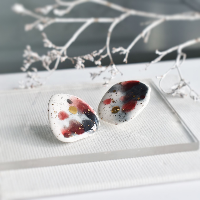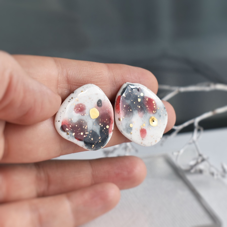 Cercei asimetrici din portelan, lucrati integral manual in atelierul nostru. Tija metalica de prindere pe ureche este din inox antialergic.