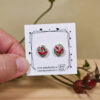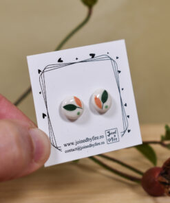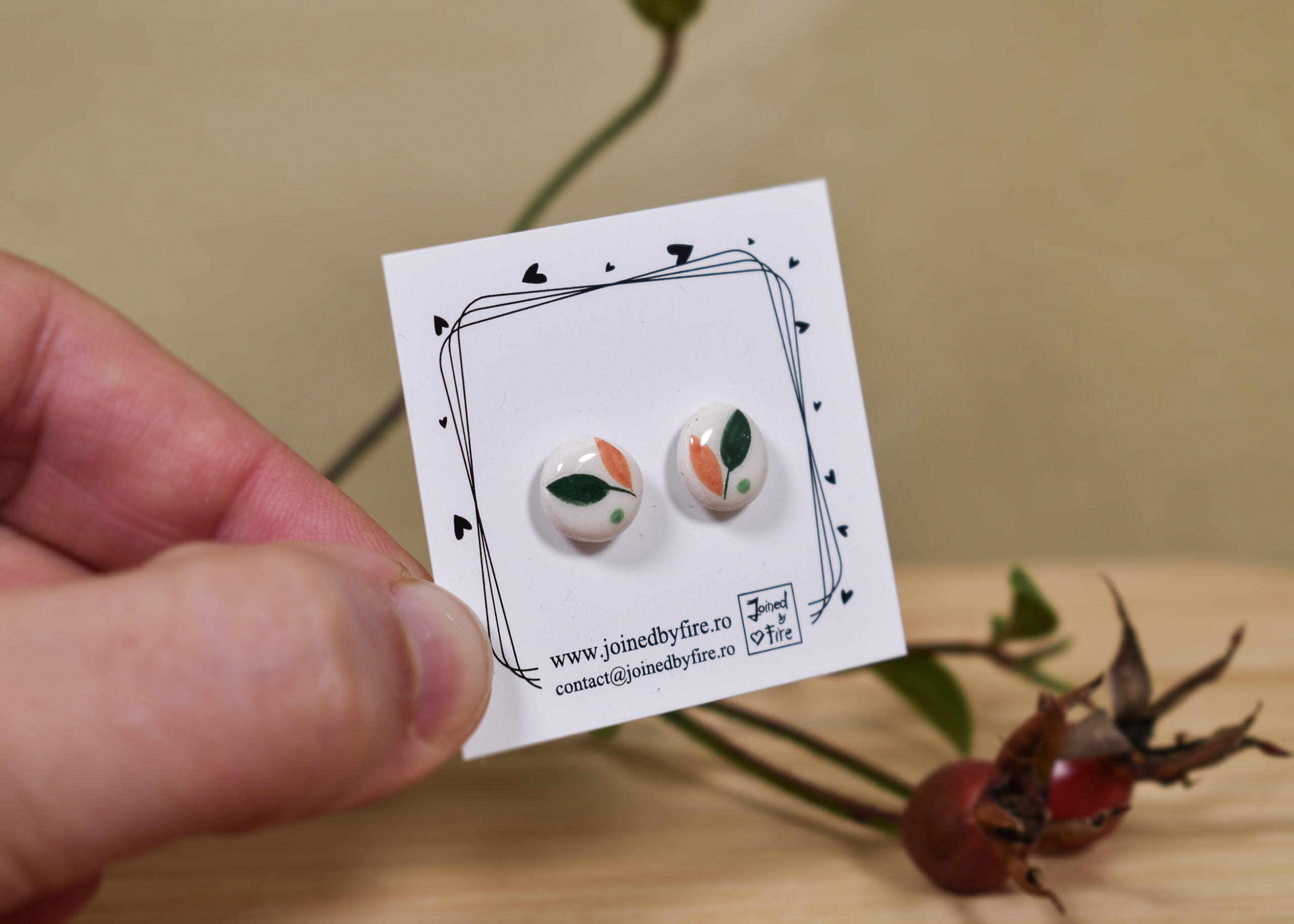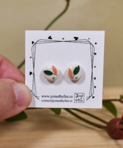 Cercei din porțelan pictat, lucrați integral manual în atelierul nostru. Tija metalică de prindere pe ureche este din inox antialergic.