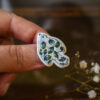 Cum se face: Piesa este întâi modelată manual din lut alb, lăsată să se usuce la aer timp de o zi, apoi șlefuită și arsă pentru prima dată în cuptorul de ceramică la 900 grade. Această primă ardere se numește ardere de biscuit, durează între 16 și 20 de ore și este arderea ce transformă lutul în ceramică. După această primă ardere piesa este glazurată și trecută printr-o nouă ardere la 1050 grade, care durează încă 20-24 de ore. În acest stadiu ilustrația este aplicată manual pe piesă și rearsă la 850 de grade, ardere care fixează ilustrația în glazură. Dacă modelul are și astfel de detalii, acestea sunt pictate manual cu aur și piesa trece printr-o a patra ardere la 850 grade, care durează 12-14 ore. La finalul acestei arderi atașăm elementele metalice în funcție de destinație: ac de broșă, tortițe pentru cercei etc.