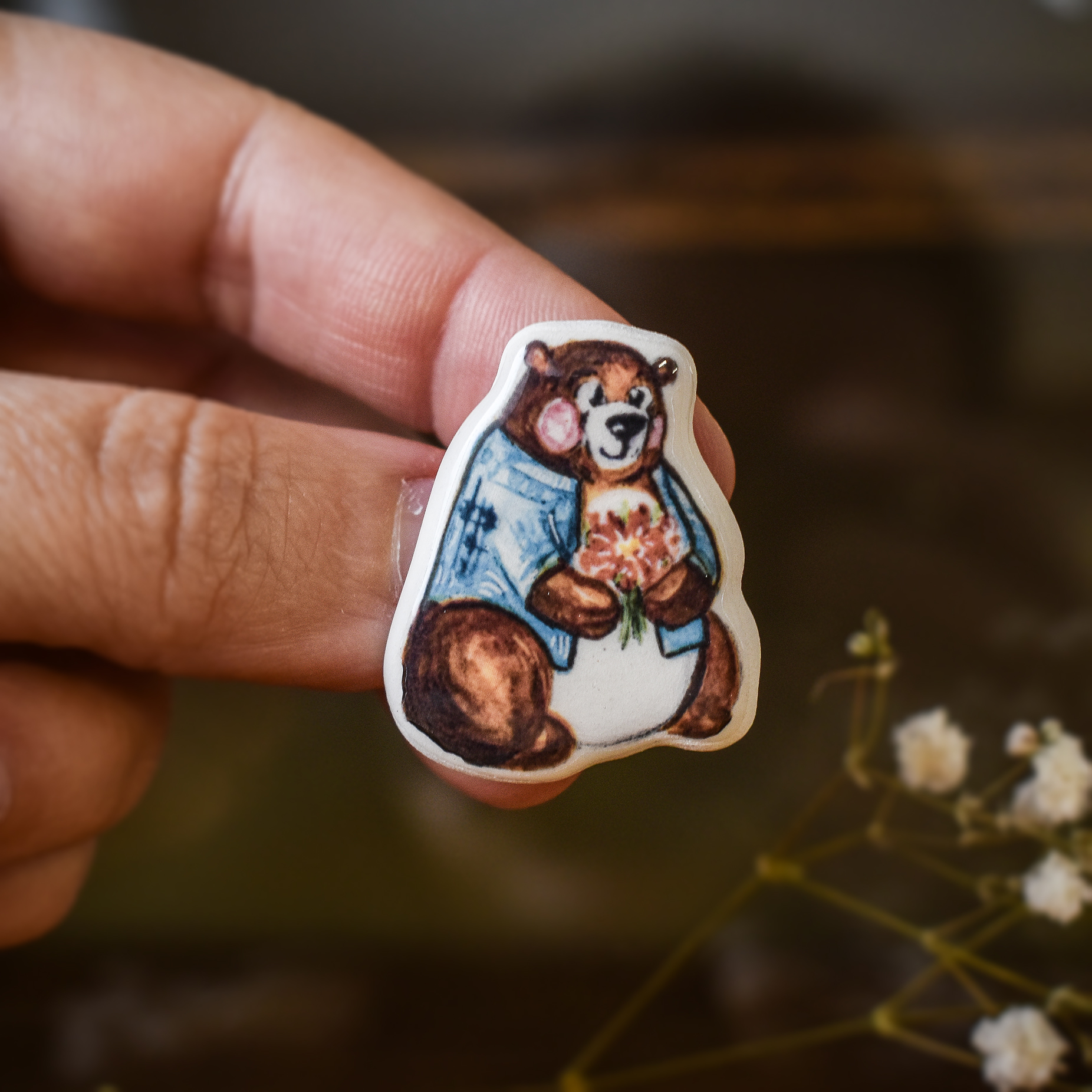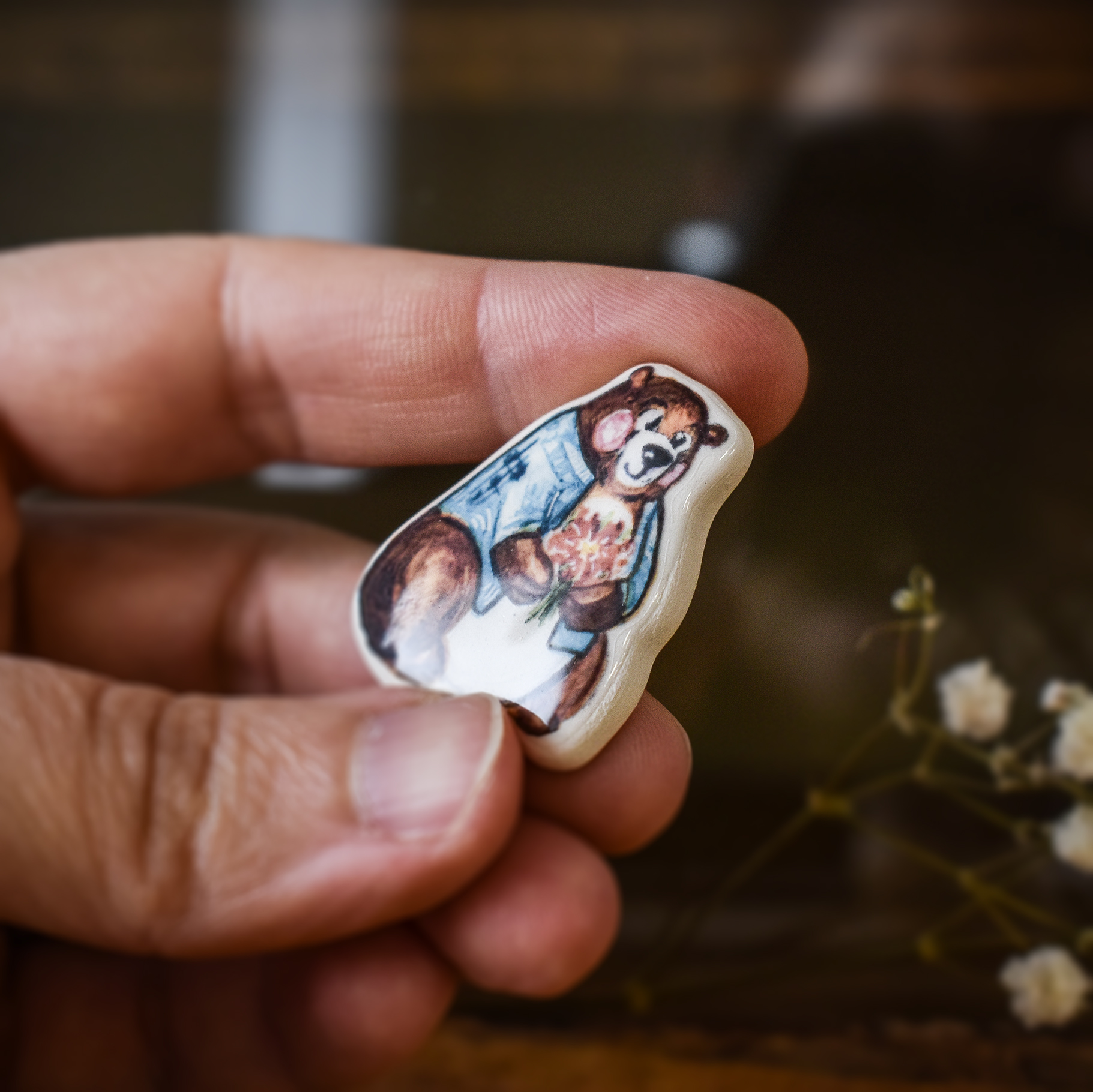 Broșă lucrată integral manual în atelierul nostru. Design-ul are la bază ilustrația noastră originală, transferată pe piesa ceramică la temperatura de 850 grade.