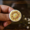 Cum se face: Piesa este întâi modelată manual din lut alb, lăsată să se usuce la aer timp de o zi, apoi șlefuită și arsă pentru prima dată în cuptorul de ceramică la 900 grade. Această primă ardere se numește ardere de biscuit, durează între 16 și 20 de ore și este arderea ce transformă lutul în ceramică. După această primă ardere piesa este glazurată și trecută printr-o nouă ardere la 1050 grade, care durează încă 20-24 de ore. În acest stadiu ilustrația este aplicată manual pe piesă și rearsă la 850 de grade, ardere care fixează ilustrația în glazură. Dacă modelul are și astfel de detalii, acestea sunt pictate manual cu aur și piesa trece printr-o a patra ardere la 850 grade, care durează 12-14 ore. La finalul acestei arderi atașăm elementele metalice în funcție de destinație: ac de broșă, tortițe pentru cercei etc.