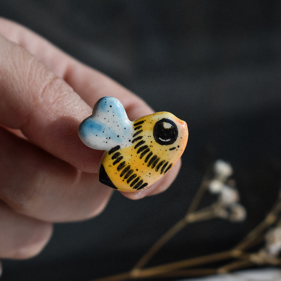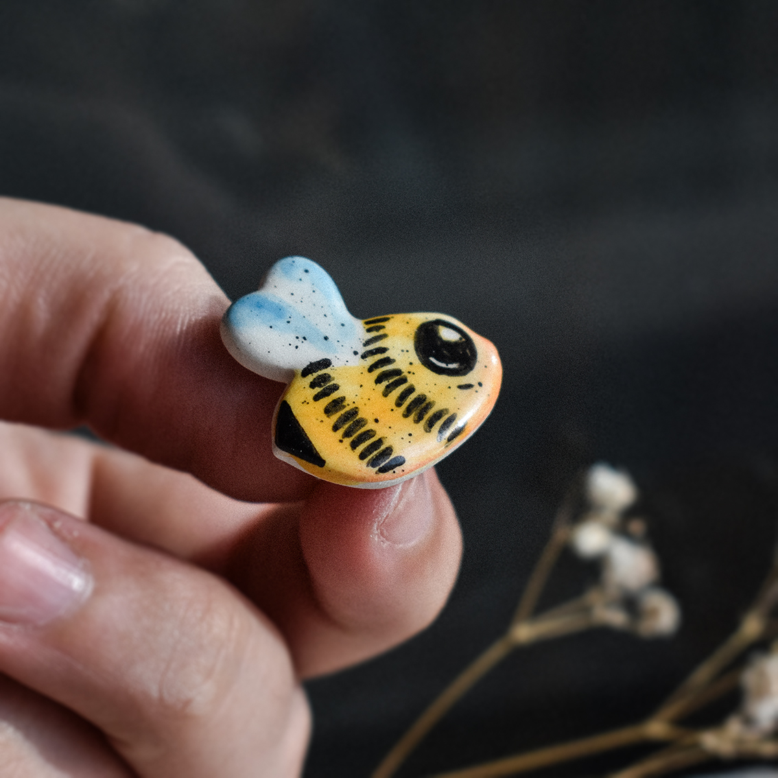 Cum se face: Piesa este întâi modelată manual din lut alb, lăsată să se usuce la aer timp de o zi, apoi șlefuită și arsă pentru prima dată în cuptorul de ceramică la 900 grade. Această primă ardere se numește ardere de biscuit, durează între 16 și 20 de ore și este arderea ce transformă lutul în ceramică. După această prima ardere piesa este pictată, glazurată și trecută printr-o nouă ardere la 1050 grade, care durează încă 20-24 de ore. În acest stadiu, dacă modelul are astfel de detalii, piesa este pictată cu aur și trecută printr-o a treia ardere la 850 grade, care durează 12-14 ore. La finalul acestei arderi piesa este pregatită pentru a îi fi atașate elementele metalice în funcție de destinație: ac de broșă, tortițe pentru cercei etc.