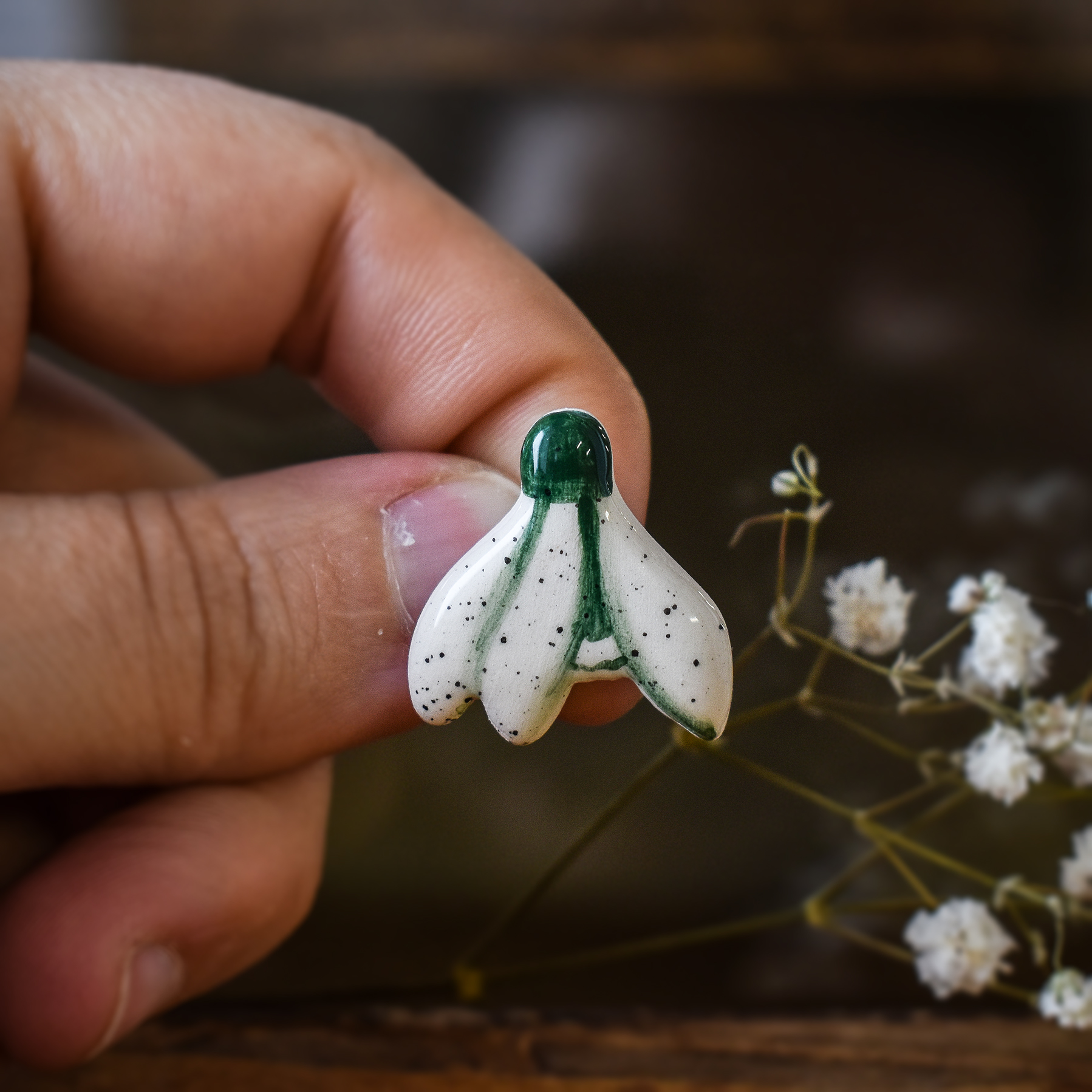 Cum se face: Piesa este întâi modelată manual din lut alb, lăsată să se usuce la aer timp de o zi, apoi șlefuită și arsă pentru prima dată în cuptorul de ceramică la 900 grade. Această primă ardere se numește ardere de biscuit, durează între 16 și 20 de ore și este arderea ce transformă lutul în ceramică. După această primă ardere piesa este pictată, glazurată și trecută printr-o nouă ardere la 1050 grade, care durează încă 20-24 de ore. În acest stadiu, dacă modelul are astfel de detalii, piesa este pictată cu aur și trecută printr-o a treia ardere la 850 grade, care durează 12-14 ore. La finalul acestei arderi piesa este pregătită pentru a îi fi atașate elementele metalice în funcție de destinație: ac de broșă, tortițe pentru cercei etc.