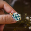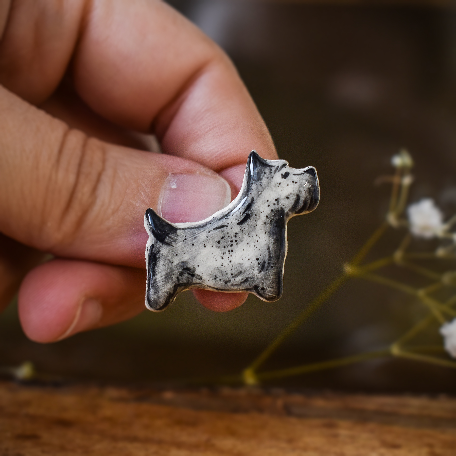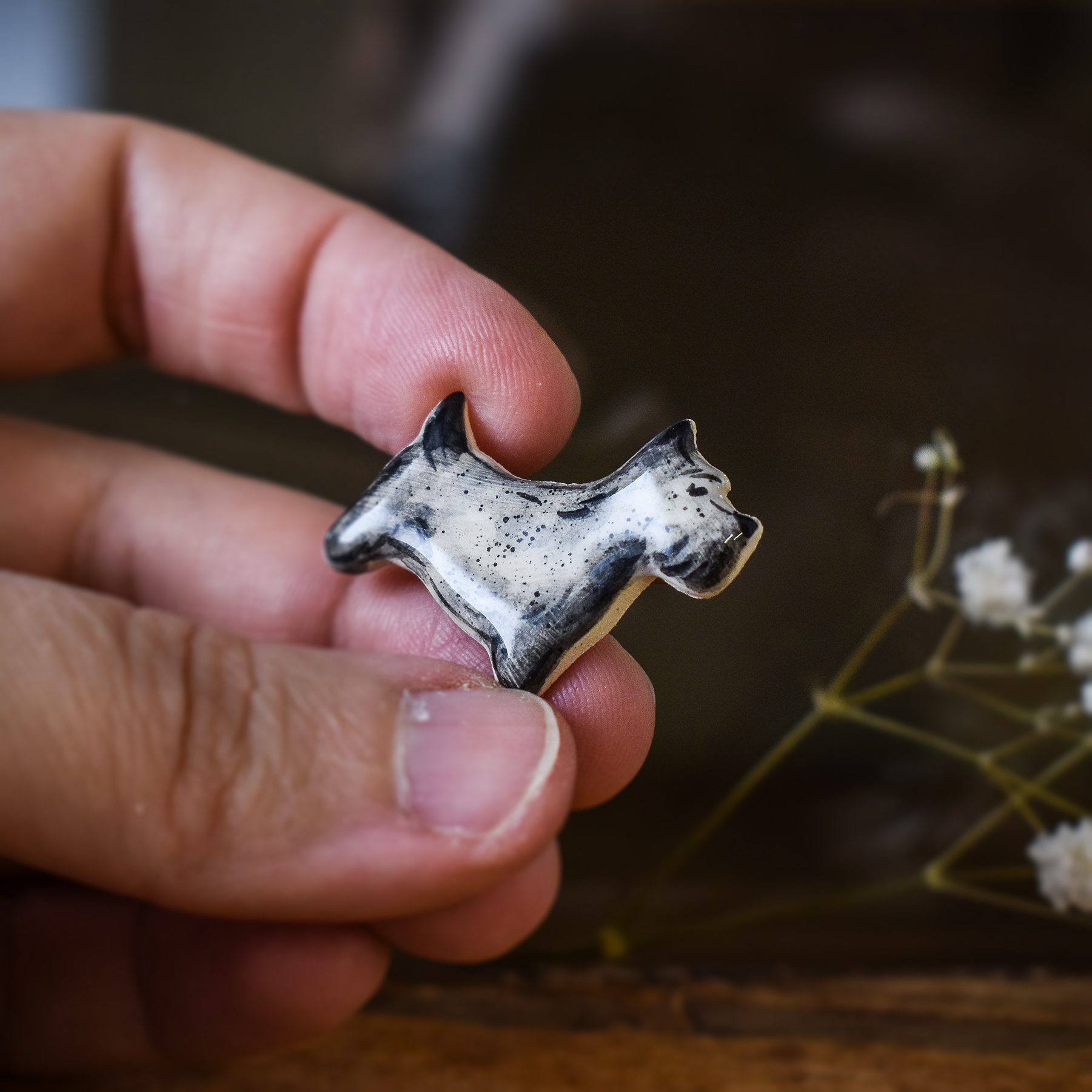 Cum se face: Piesa este întâi modelată manual din lut alb, lăsată să se usuce la aer timp de o zi, apoi șlefuită și arsă pentru prima dată în cuptorul de ceramică la 900 grade. Această primă ardere se numește ardere de biscuit, durează între 16 și 20 de ore și este arderea ce transformă lutul în ceramică. După această primă ardere piesa este pictată, glazurată și trecută printr-o nouă ardere la 1050 grade, care durează încă 20-24 de ore. În acest stadiu, dacă modelul are astfel de detalii, piesa este pictată cu aur și trecută printr-o a treia ardere la 850 grade, care durează 12-14 ore. La finalul acestei arderi piesa este pregătită pentru a îi fi atașate elementele metalice în funcție de destinație: ac de broșă, tortițe pentru cercei etc.