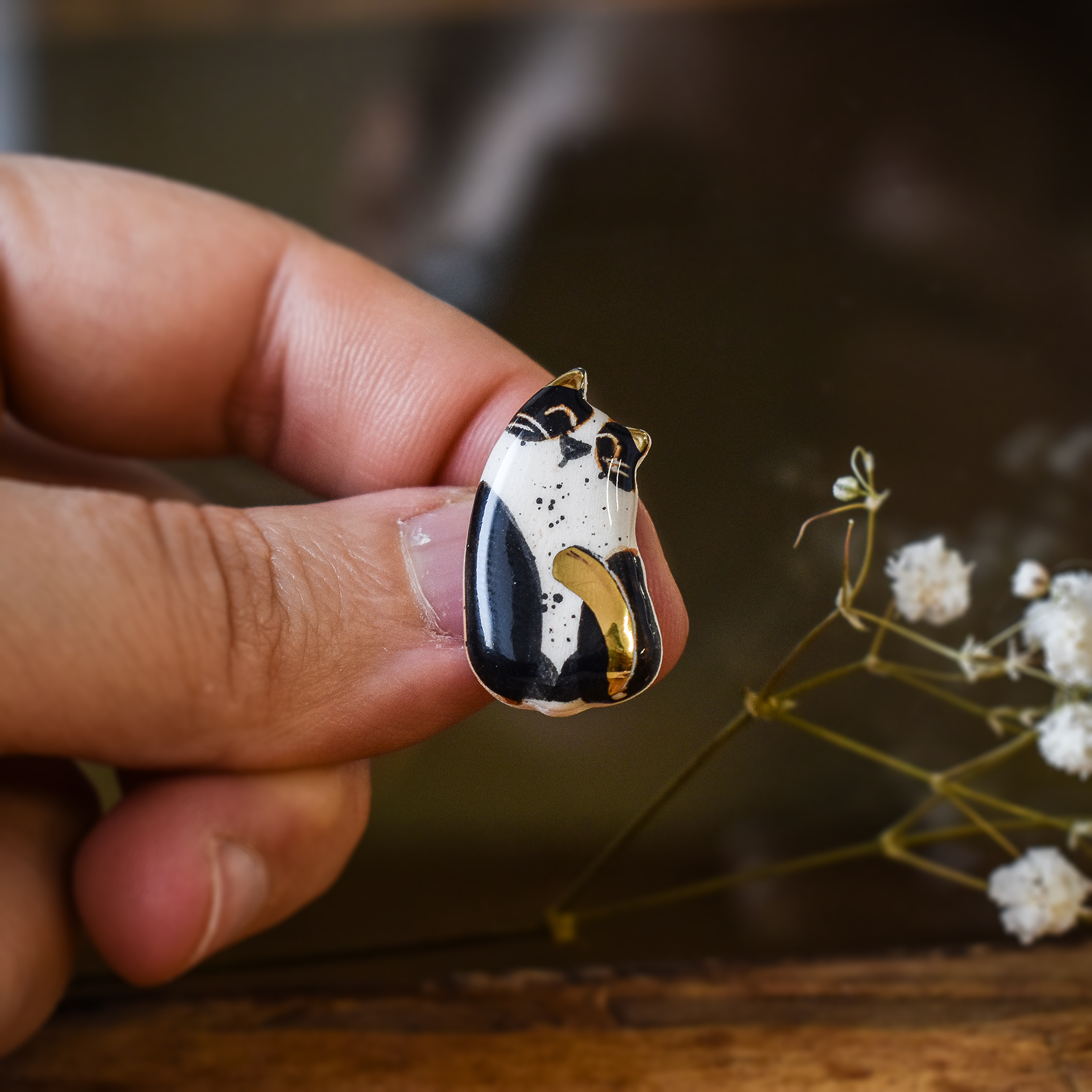 Cum se face: Piesa este întâi modelată manual din lut alb, lăsată să se usuce la aer timp de o zi, apoi șlefuită și arsă pentru prima dată în cuptorul de ceramică la 900 grade. Această primă ardere se numește ardere de biscuit, durează între 16 și 20 de ore și este arderea ce transformă lutul în ceramică. După această primă ardere piesa este pictată, glazurată și trecută printr-o nouă ardere la 1050 grade, care durează încă 20-24 de ore. În acest stadiu, dacă modelul are astfel de detalii, piesa este pictată cu aur și trecută printr-o a treia ardere la 850 grade, care durează 12-14 ore. La finalul acestei arderi piesa este pregătită pentru a îi fi atașate elementele metalice în funcție de destinație: ac de broșă, tortițe pentru cercei etc.