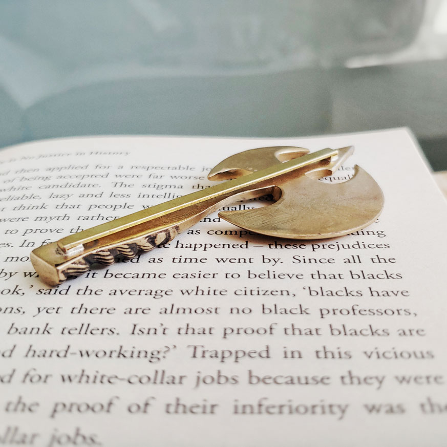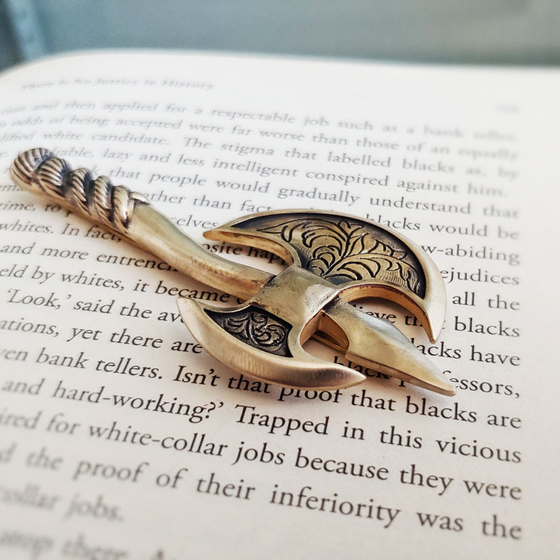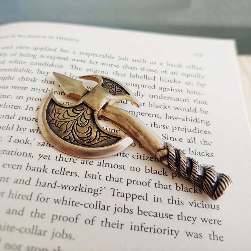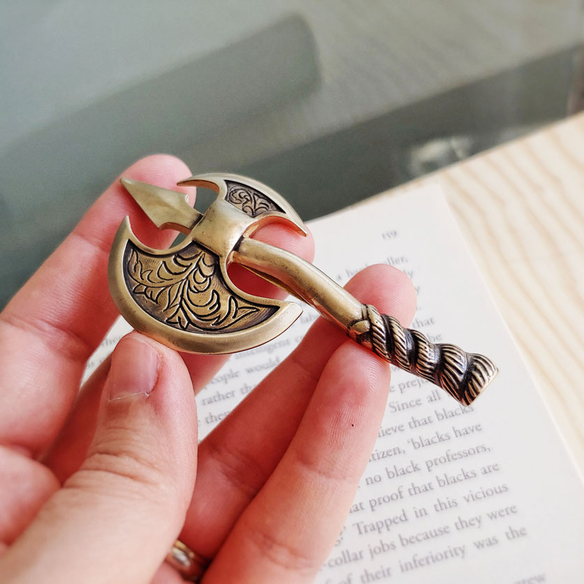 Semn de carte cu design original, inspirat de armele gnomilor din “Hobbit”, constituie un cadou grozav pentru iubitorii de literatura si filme fantasy, mai ales ai fanilor Tolkien si “Lord of the Rings”. Are un profil suficient de inalt incat sa arate bine, sa ii dea greutate, dar care sa ii permita sa se aseze in carte si cand este inchisa.